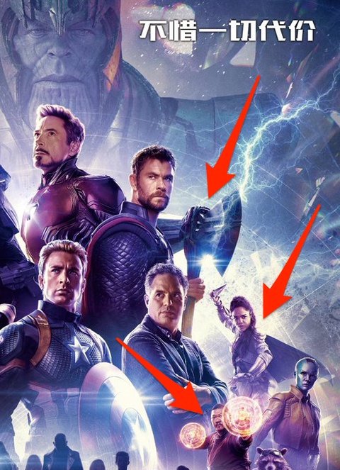 接下來看看中國版本的吧:5. 薩諾斯位置:在中國版本中薩諾斯雖然被放在最後面,但是巨大的占幅彷彿像是上帝的角度一樣看著大家,是所有海報中最「挺薩諾斯」的。