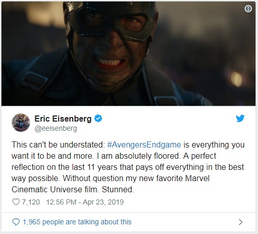 Collider的Steven Weintraub:「不知道是否會有任何漫威粉絲會在看完《復仇者聯盟:終局之戰》後失望走出來的,電影充滿了令人難以置信的元素和無數的小角色會讓你想要看更多,是漫威10年電影中史詩般的結局,感謝每一位在MCU工作的人。」